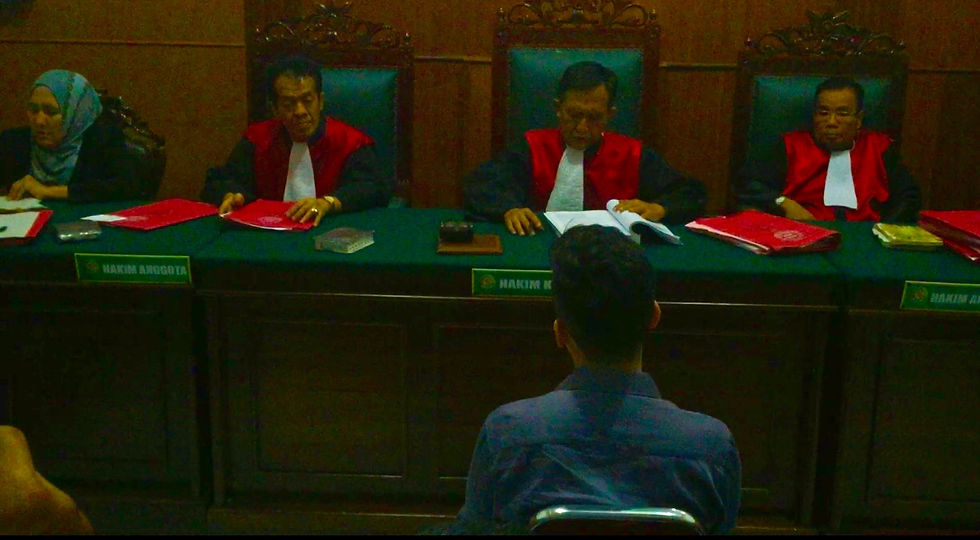 Lima orang terdakwa, Giri Bayu Kusuma, Dewi Megawati Aldona Doni, Jenifer Berby Aldona Doni, Muhammad Rizzal dan Muhammad Baslum menghadiri sidang yang dipimpin ketua majelis hakim Syifa'urosidin, dan jaksa penuntut umum (JPU) Damang anubowo tersebut, digelar di ruang Sari 1 Pengadilan Negeri (PN) Surabaya, dengan agenda pemeriksaan saksi korban.